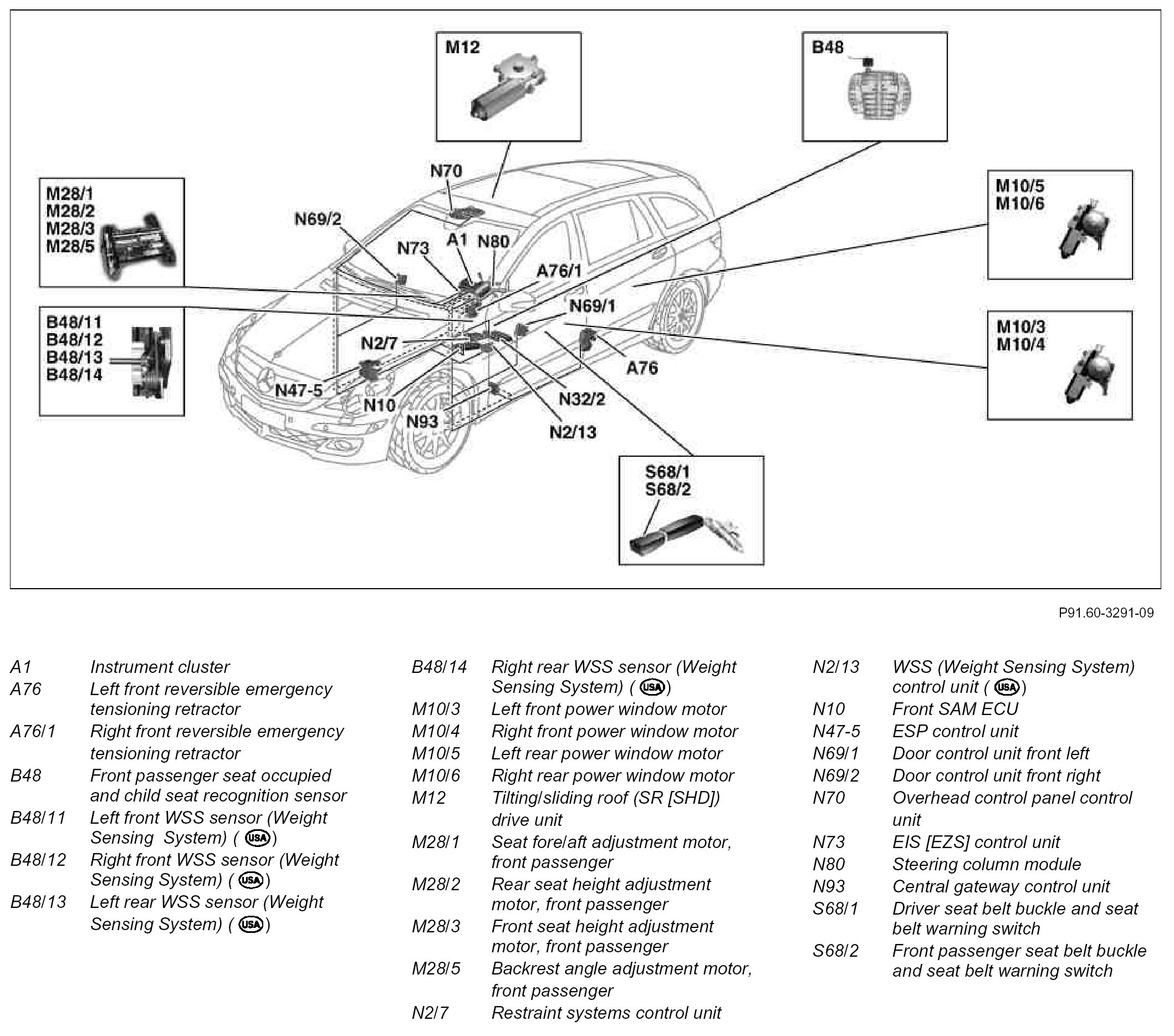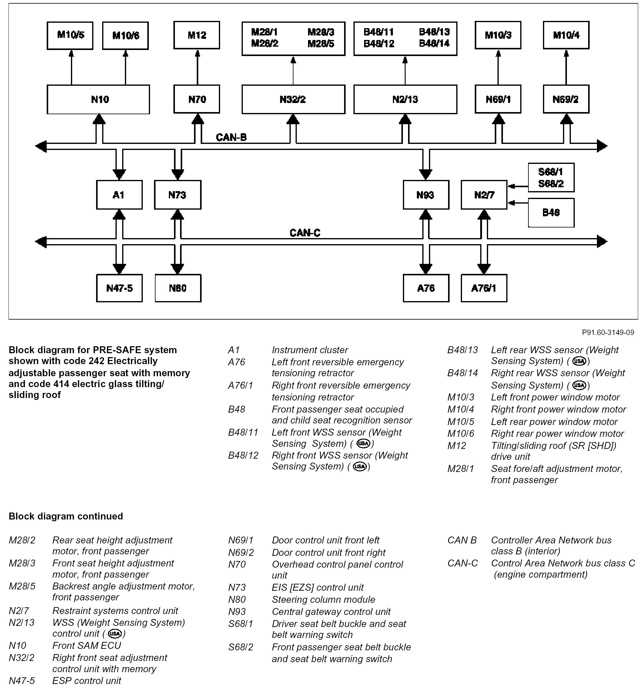 The left front/right front reversible emergency tensioning retractors send the conditioning request of the front passenger seat cyclically over CAN-C, the central gateway control unit, the Controller Area Network bus Class B (interior) (CAN-B) to the front passenger front seat adjustment control unit with memory.
