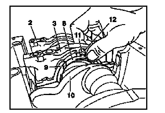 Installation: The anti-twist locks (11) of the lower thrust washers (8) must be located in the slots (12) of the fit bearing cap (3). The oil grooves (9) of the lower thrust washers (8) must point toward the crankshaft webs (10).