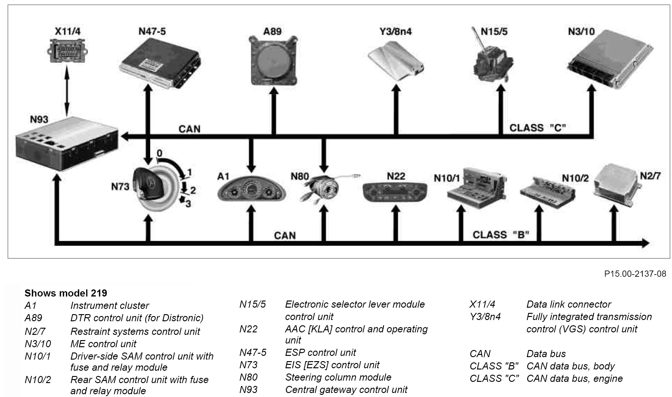 The interface of the two CAN data buses (gateway) takes place in the central gateway control unit (N93), which also represents the interface between the control units on the CAN data bus and the line to the data link connector (X11/4) for STAR DIAGNOSIS.