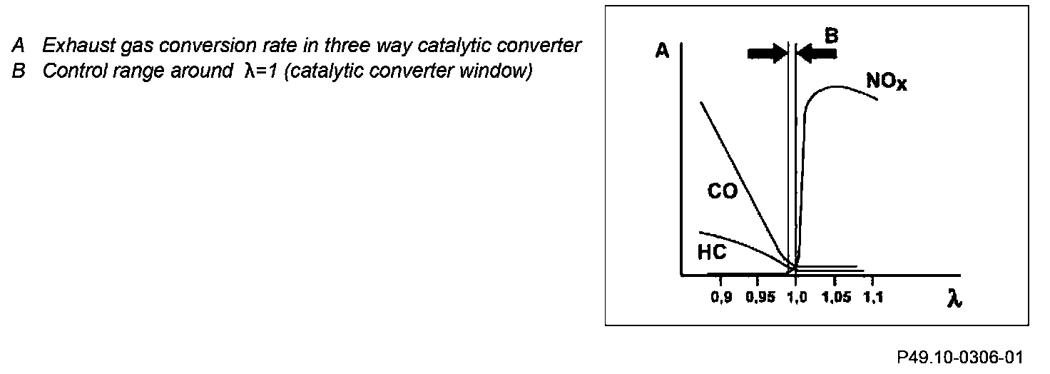 The O2 sensors upstream of the catalytic converter the oxygen concentration in the exhaust and transmit corresponding signals to the ME-SFI [ME] control unit. This changes the mixture composition so that in all engine operating statuses, the desired oxygen (usually (Lambda) =1) is set.