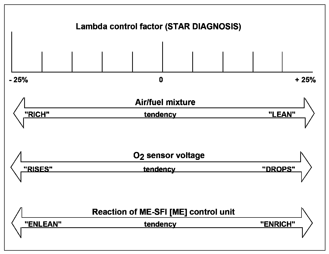 This makes it possible to achieve an air/fuel composition of approximately (Lambda)=1. The reading of the lambda control factor with the STAR DIAGNOSIS moves towards +25 % The more the lambda control factor moves towards +25 %, the leaner is the air/fuel mixture and the greater is the enrichment of the mixture on the part of the ME-SFI [ME] control unit.