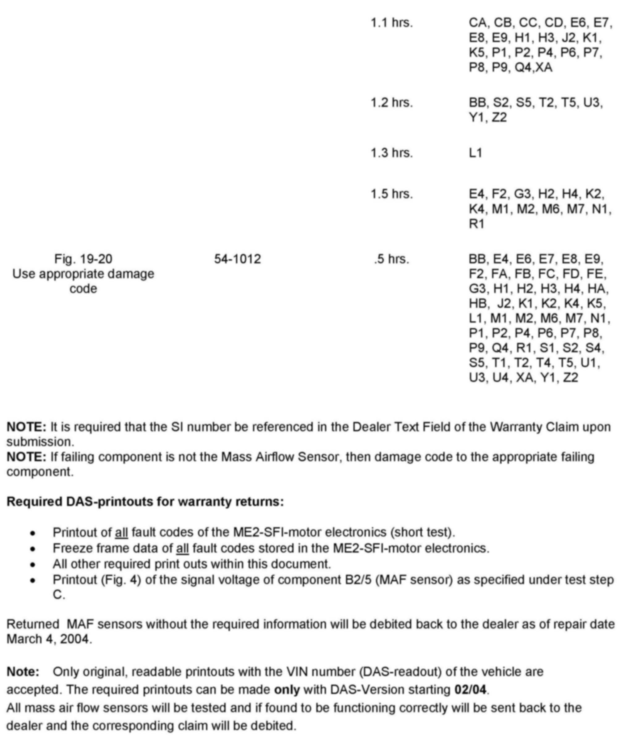 Only original, readable printouts with the VIN number (DAS-readout) of the vehicle are accepted. The required printouts can be made only with DAS-Version starting 02/04. All mass air flow sensors will be tested and if found to be functioning correctly will be sent back to the dealer and the corresponding claim will be debited.