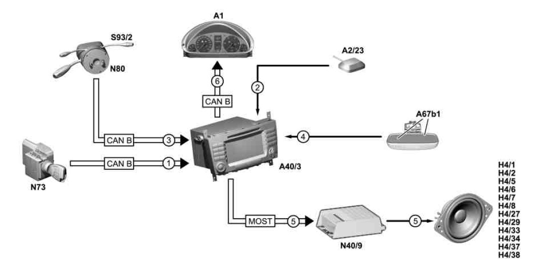 The signals for displaying the arrow pictograms in the multifunction display of the instrument cluster are forwarded by the COMAND operating, display and controller unit to the instrument cluster via interior CAN.
