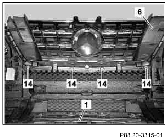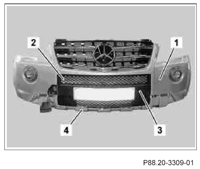 The catch tabs on the center cover grill (2) and center cover grill cover (3) must arrest correctly in the front bumper paneling (1).