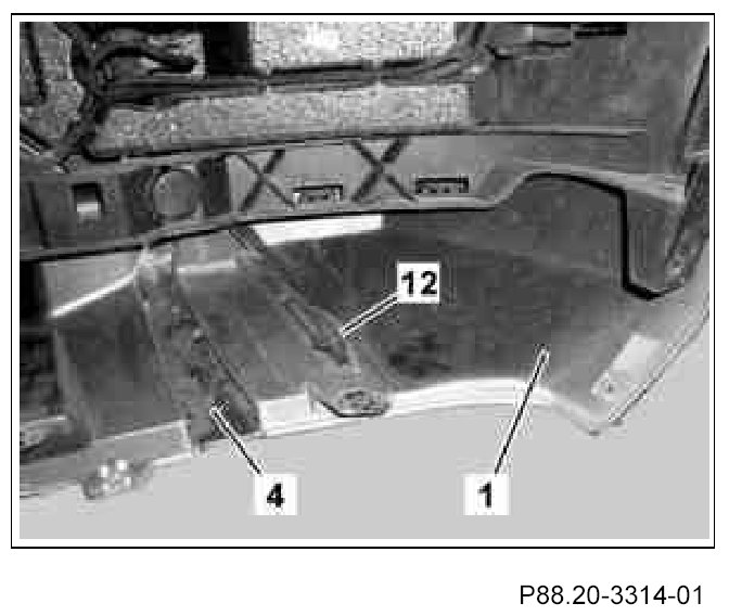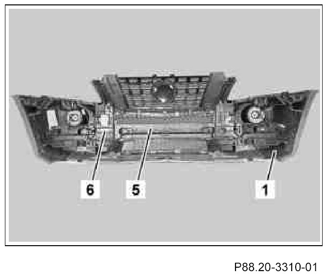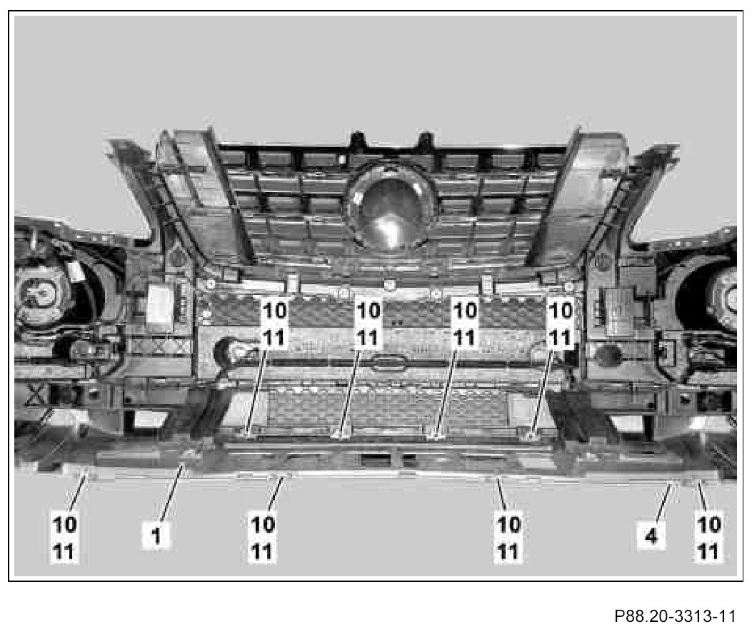 The catch tabs on the underride guard (4) must arrest correctly in the front bumper paneling (1).
