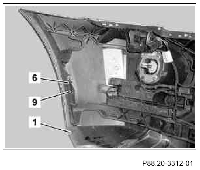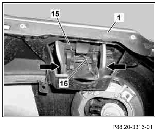 The catch tabs on the front fog lamps covers (19) must catch properly in the front paneling (1).