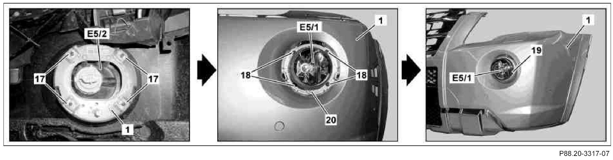 11. Insert left front fog lamp (E5/1) and right front fog lamp (E5/2) from front into front paneling (1) and fasten with four 4.2x19 round Allen head bolts (18).