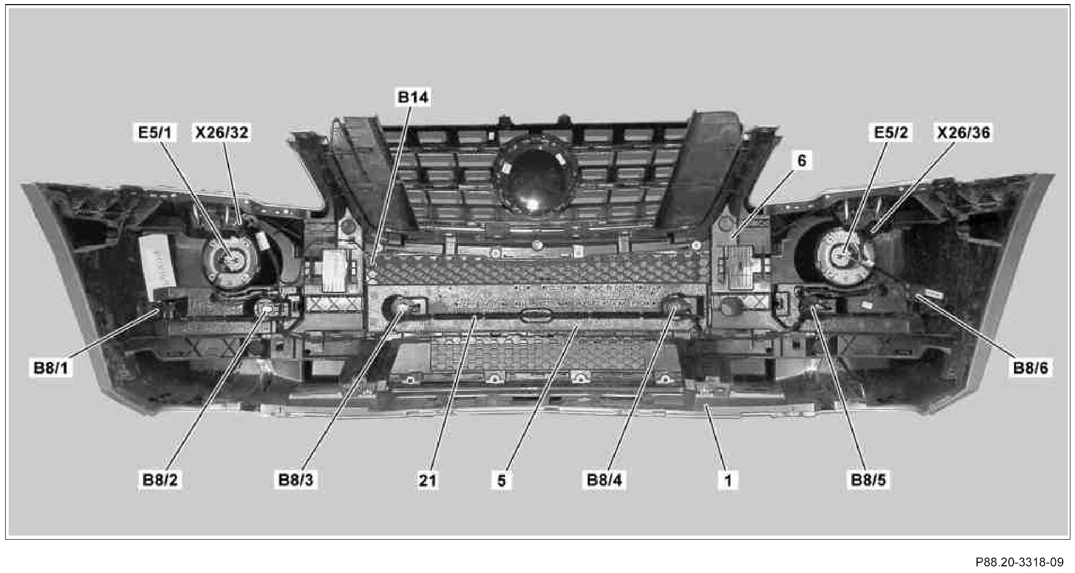 14. Clip outer left front PTS ultrasonic sensor (B8/1), center left front PTS ultrasonic sensor (B8/2), inner left front PTS ultrasonic sensor (B8/3), inner right front PTS ultrasonic sensor (B8/4), center right front PTS ultrasonic sensor (B8/5) and outer right front PTS ultrasonic sensor (B8/6) into brackets on front paneling (1).