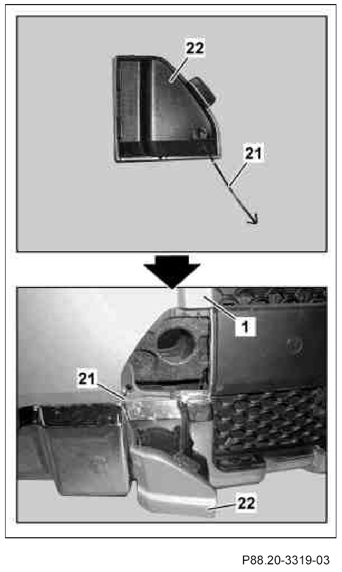 12. Insert front fog lamp cover (19) on right and left from front into front paneling (1) and arrest.