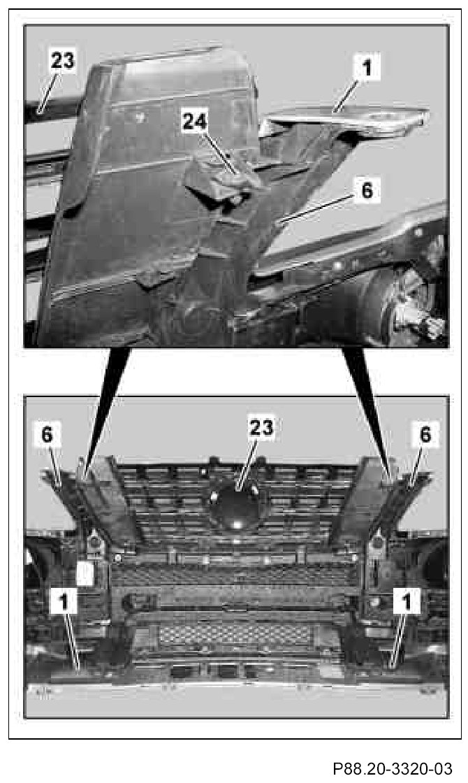 The catch tabs on the radiator air ducting (23) must catch properly in the front paneling (1) and basic carrier (6).