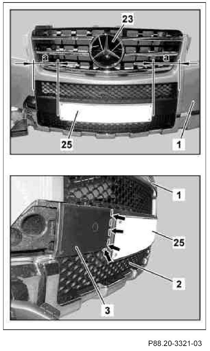 Use license plate frame (25) as template for marking holes. The distance (a) between the outer edge of the license plate frame (25) and the edge of the air inlet in the front paneling (1) should be equal. Center license plate frame (25) (see picture at top) and align along contour of center cover grill cover (3) (see picture at bottom).