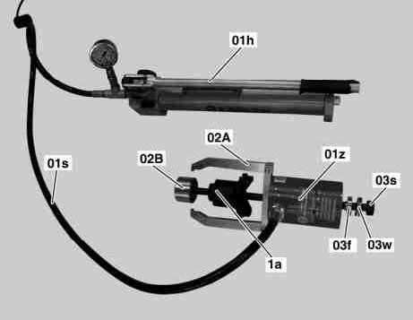9 Insert threaded spindle (03s) from below through the hollow cylinder (01z) and bearing (1a) and screw down with extraction and insertion tool part B (02B).