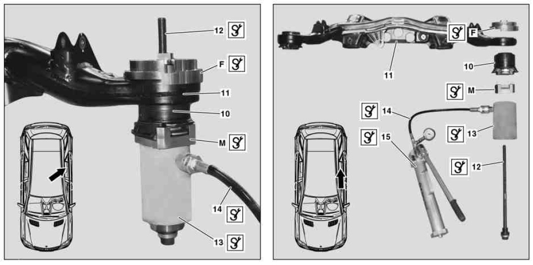 2 Fit front plate (M) and front rubber mount (10) on to the hollow cylinder (13). Feed threaded spindle (12) through the hollow cylinder (13), the front plate (M), the front rubber mount (10) and the rear axle carrier (11), screw on nut block (F).