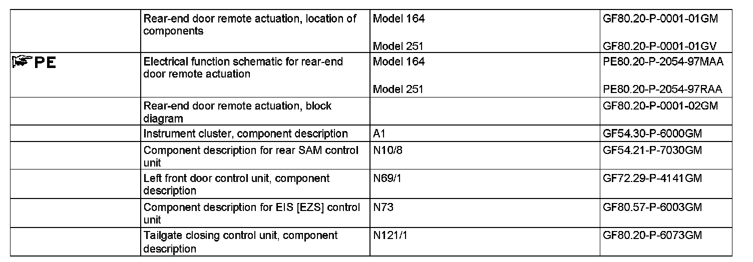 If the rear-end door button on the transmitter key is actuated for longer than t = 0.5 s a request is output to open the rear-end door. The request is transmitted by the transmitter key via radio to the roof antenna module and is relayed via the radio antenna interference suppression filter to the rear SAM control unit. The rear SAM control unit transmits it to the interior CAN. The EIS control unit read in the request and checks the authorization of the transmitter key.