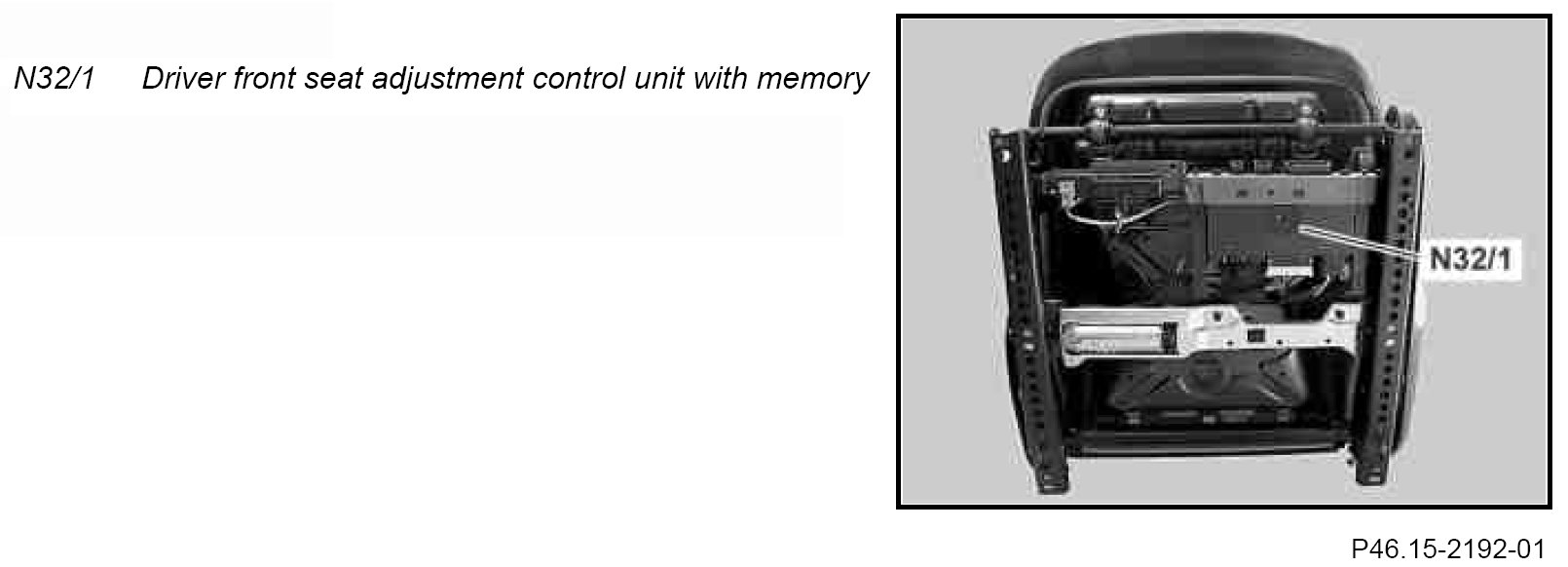 The driver-side front seat adjustment control unit with memory is located under the seat frame of the driver seat; the front passenger front seat adjustment control unit with memory (N32/2) is located under the seat frame of the front passenger seat.