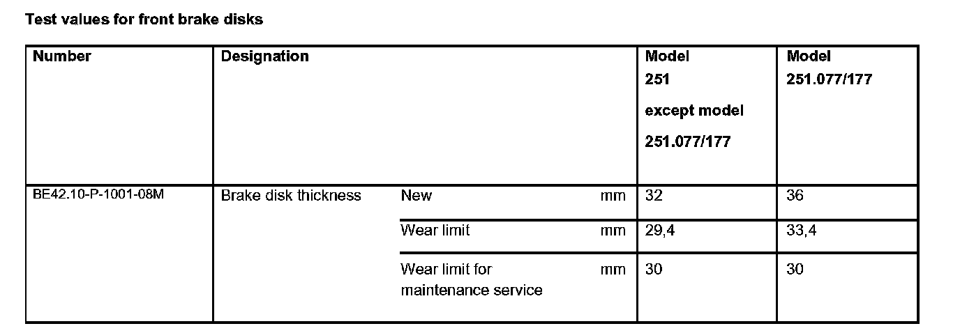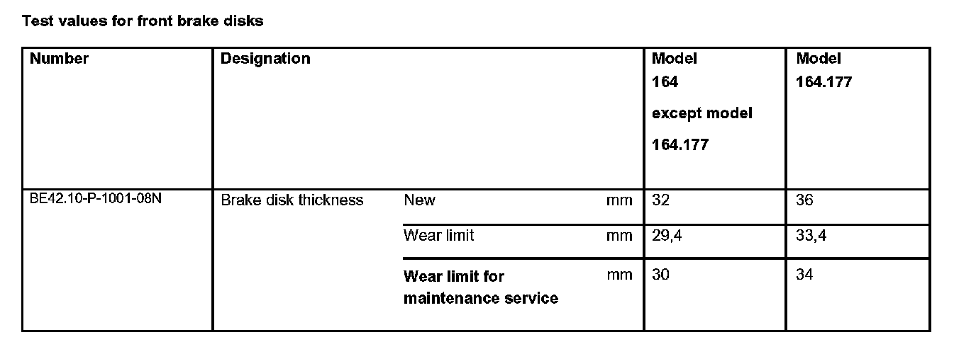 Test values for front brake disks: