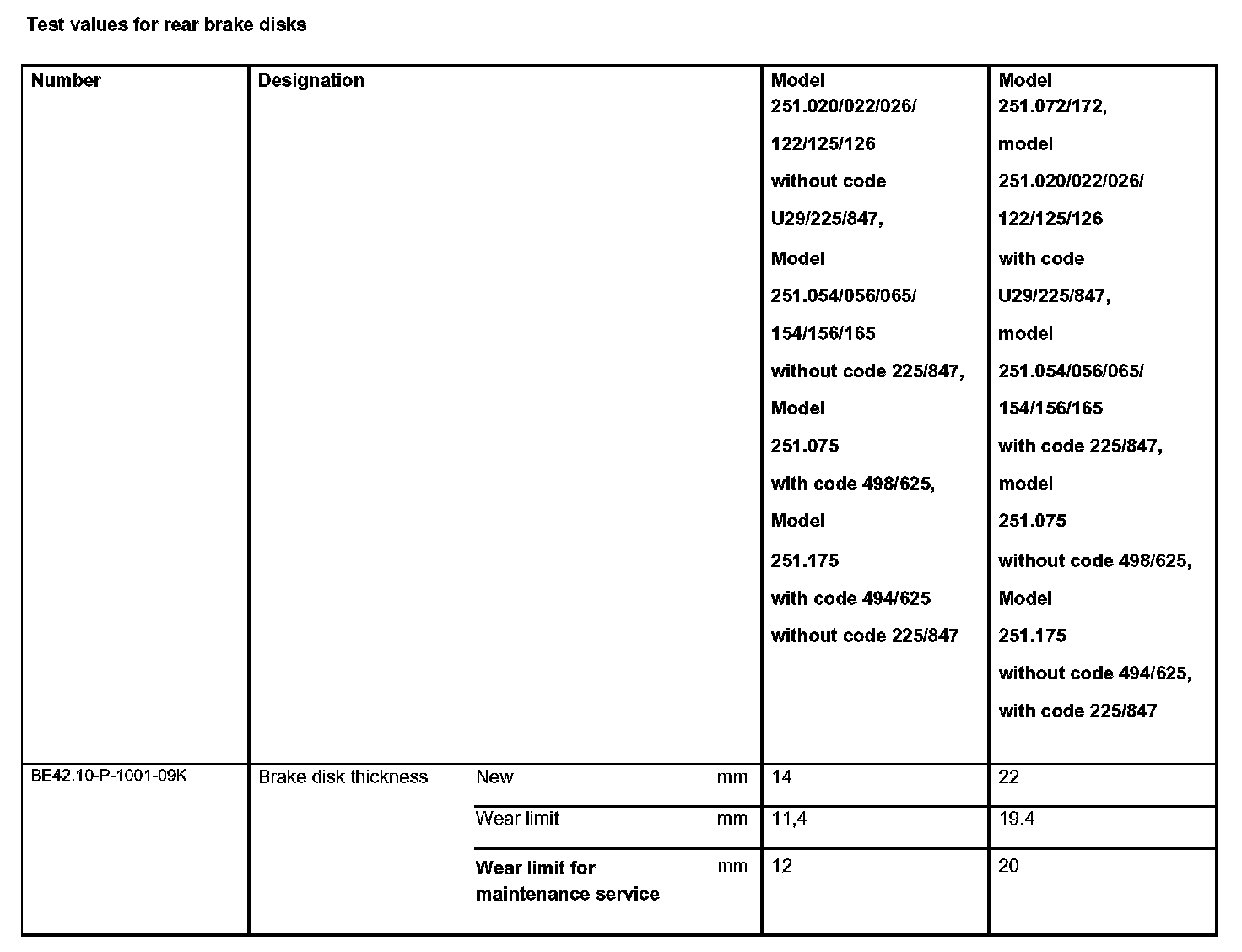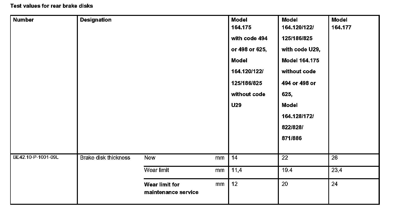 Test values for rear brake disks: