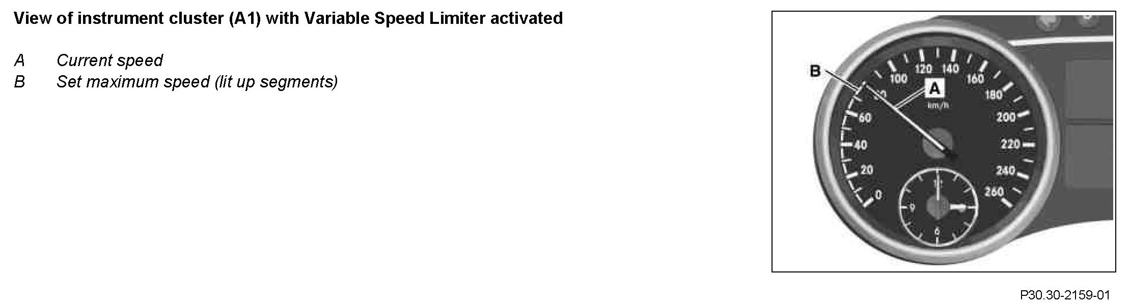 When the Variable Speed Limiter is activated, the segments in the electronic speedometer (A1p8) are illuminated from the beginning of the scale up to the set maximum speed.