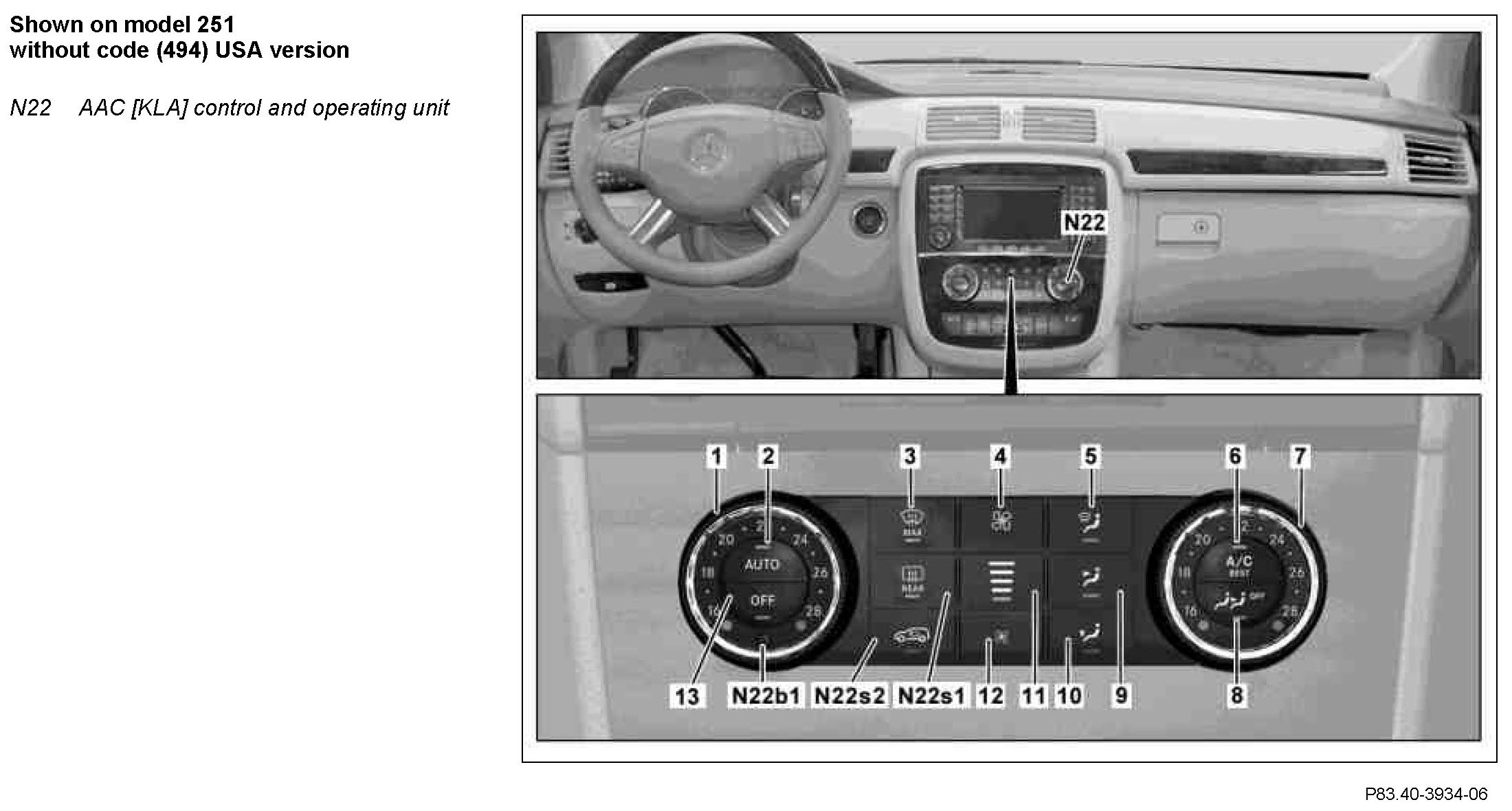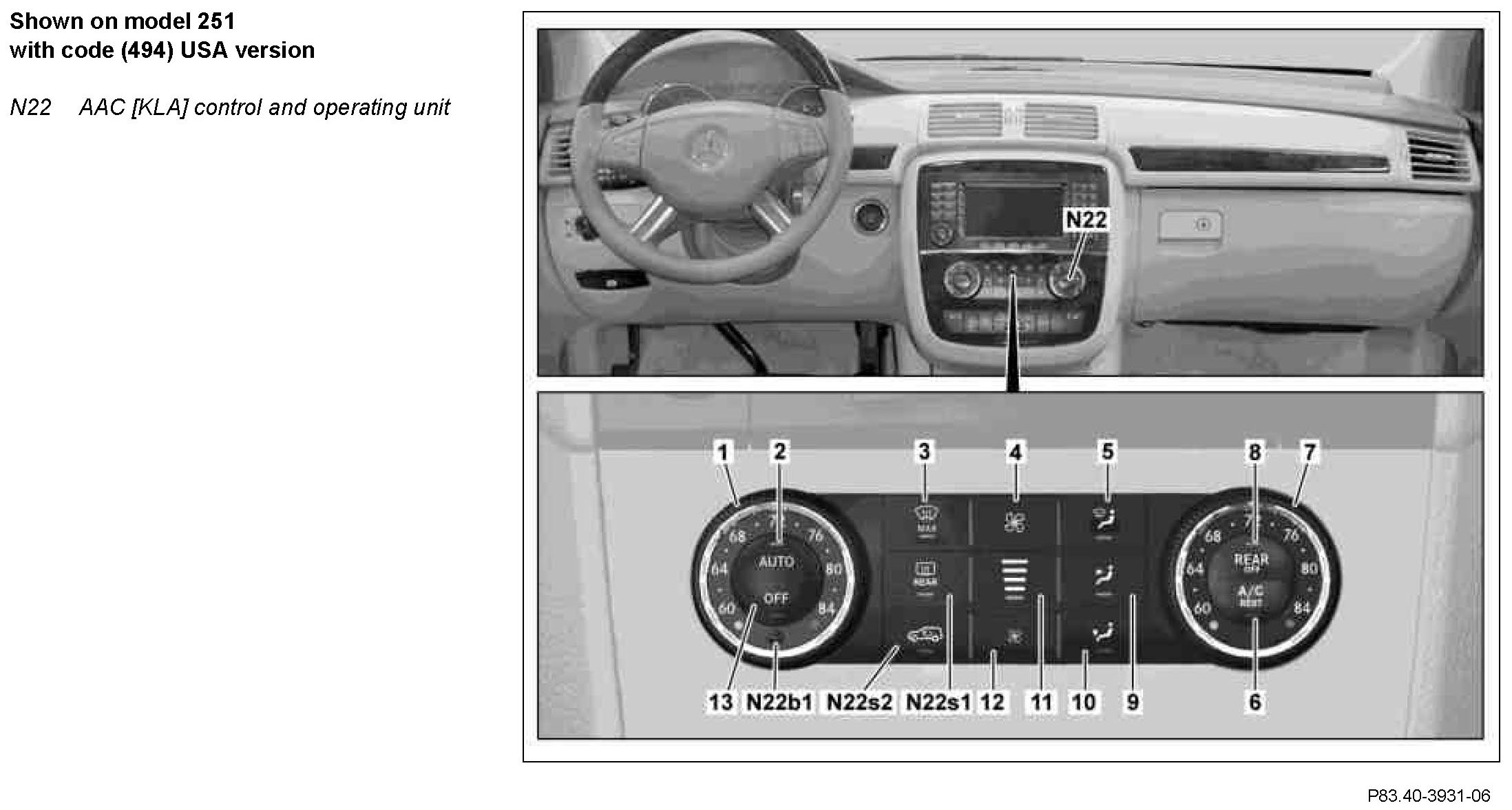 With circuit 15 ON, press the "A/C", "REST" button to switch the refrigerant compressor (A9) (not on model 164.195) or the electric refrigerant compressor control unit (N19/4) (on model 164.195) on or off. All other functions are retained.
