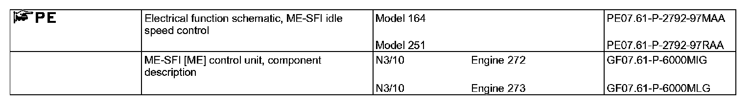 The ME-SFI control unit regulates the idle speed through the throttle valve actuator (M16/6), and adapts the injection time of the fuel injection valves (Y62) according to variations in the air mass.