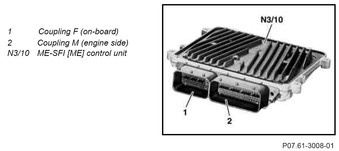 The ME-SFI control unit is always equipped with an immobilizer. When the vehicle is locked, the drive authorization system control unit transmits information over the CAN data bus to the ME-SFI control unit, which thereupon interlocks the engine management system (fuel injection system). The engine can be started (start enable) only when the vehicle is unlocked with the authorized key again and the control unit of the drive authorization system sends information to this effect to the ME-SFI [ME] control unit via the CAN data bus.
