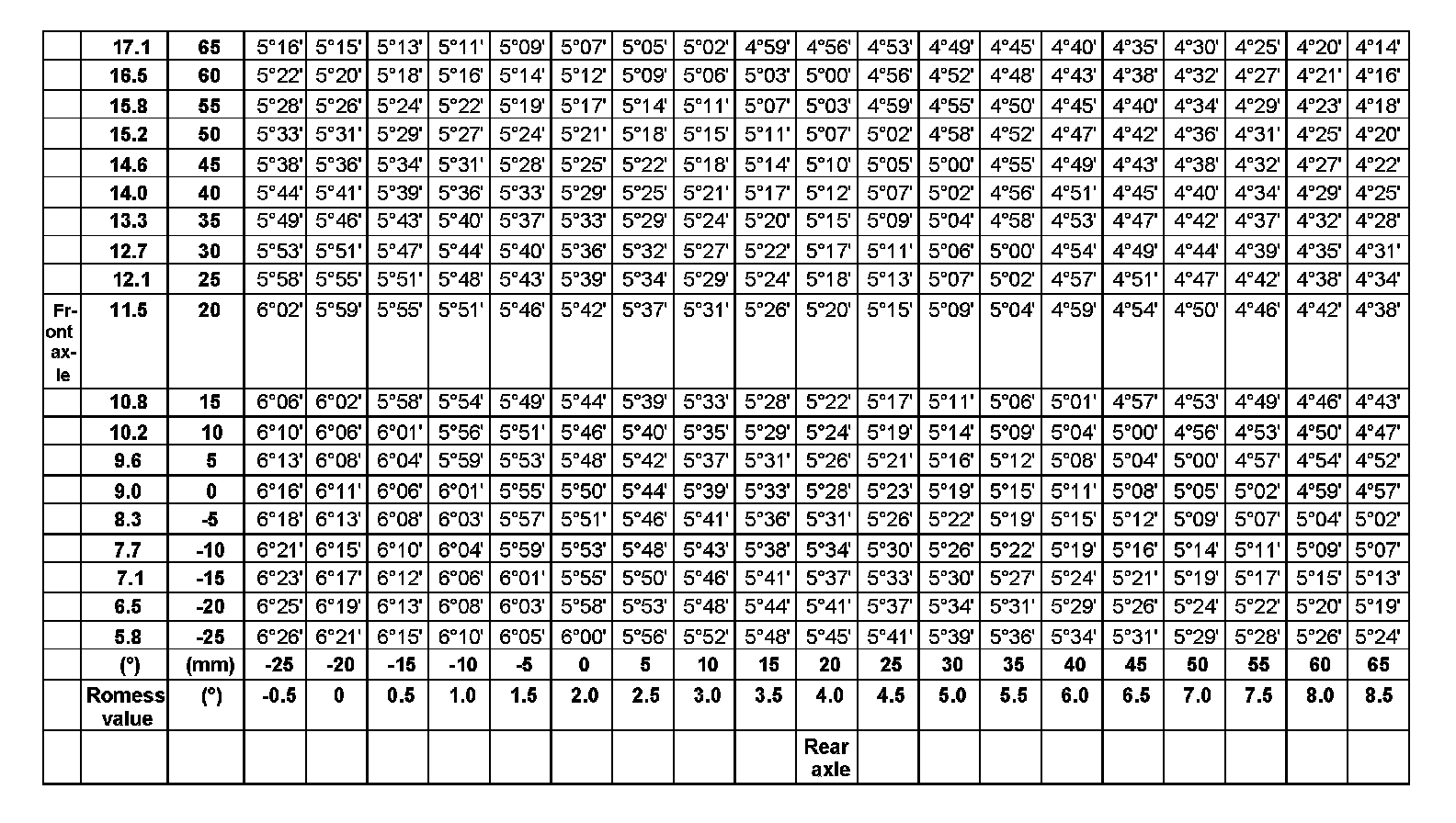 The level value is displayed by the electronic level gauge in decimal degrees only (Romess value). The details given in millimeters in the caster table only serve for a better understanding.