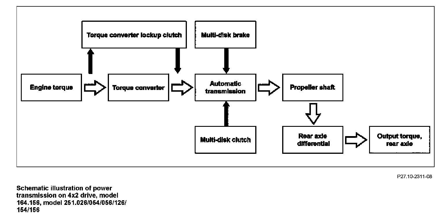 "Power flow" refers to the transmission paths of driving power and engine torque. The engine torque is transferred to the drive wheels via the following mechanical and hydraulic connections: