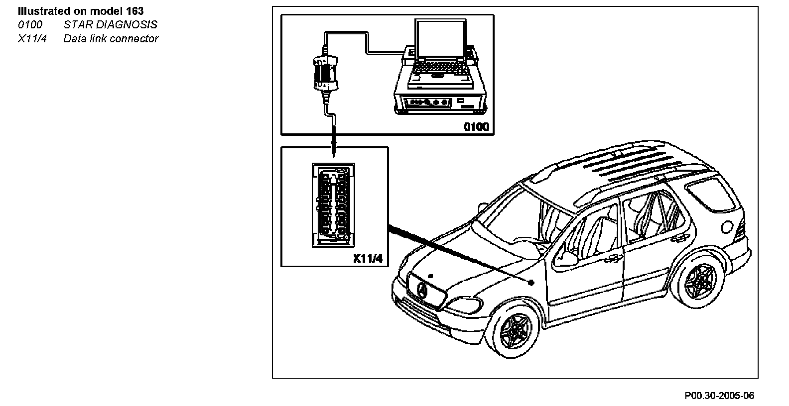 1 Connect STAR DIAGNOSIS (0100) to diagnostic socket, on the data link connector (X11/4) or on the data link connector (1.3) (X11/22).