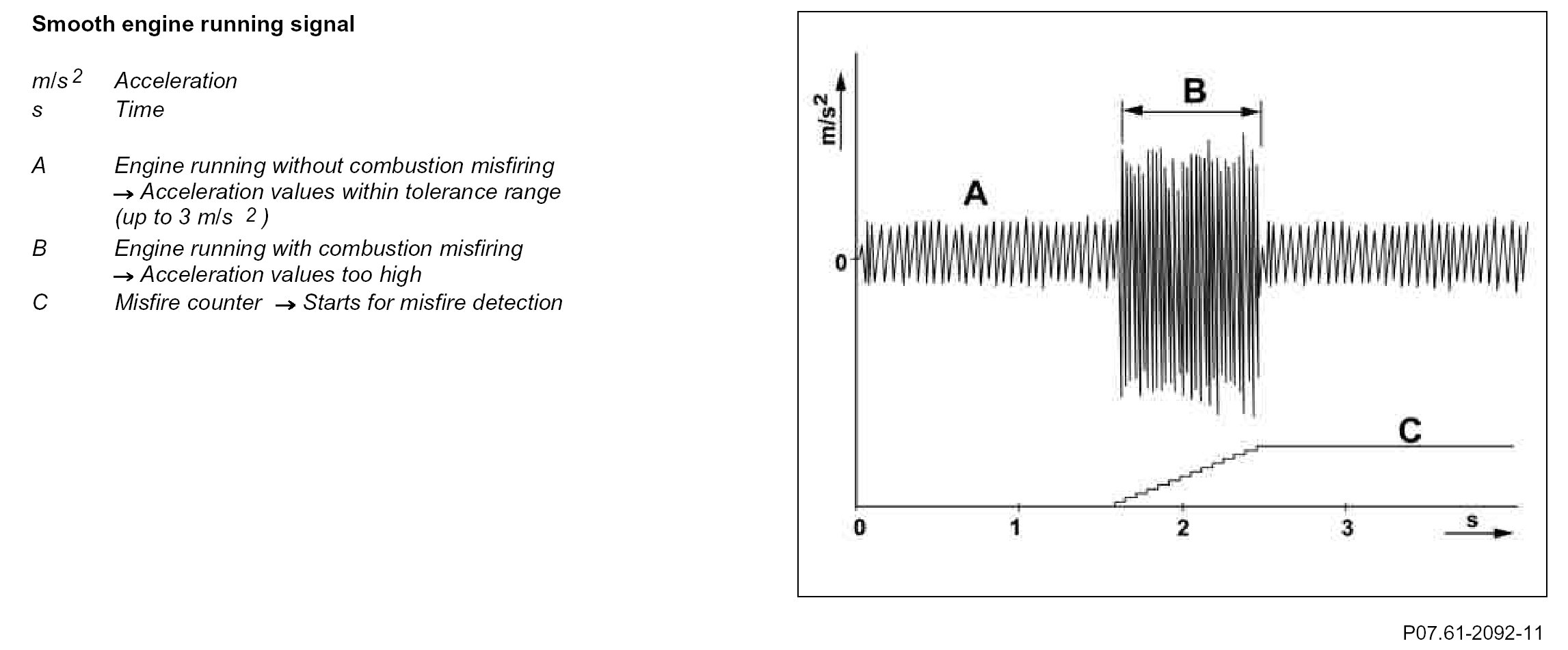 The ME-SFI [ME] control unit stores the smooth operation characteristics of the engine during a deceleration phase accelerator pedal not operated) when uniform smooth operation is present. These are required as a comparison parameter for misfire detection.
