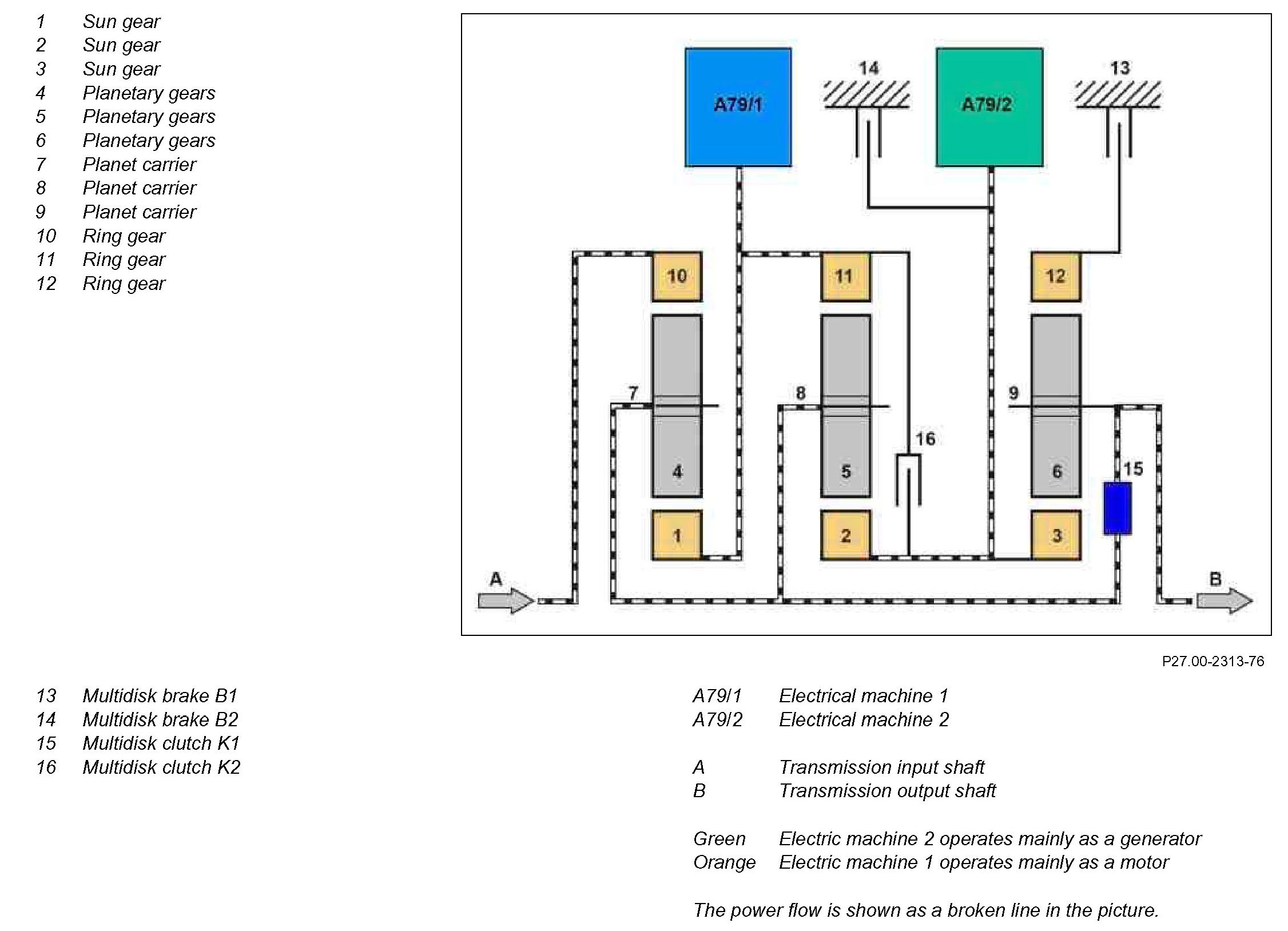 The ring gear (11) rotates at the same speed due to the mechanical connection to the sun gear (1). The planetary gears (5) roll over the sun gear (2) and transfer the rotary motion to electric machine 2. This operates mainly as a generator depending on various factors.