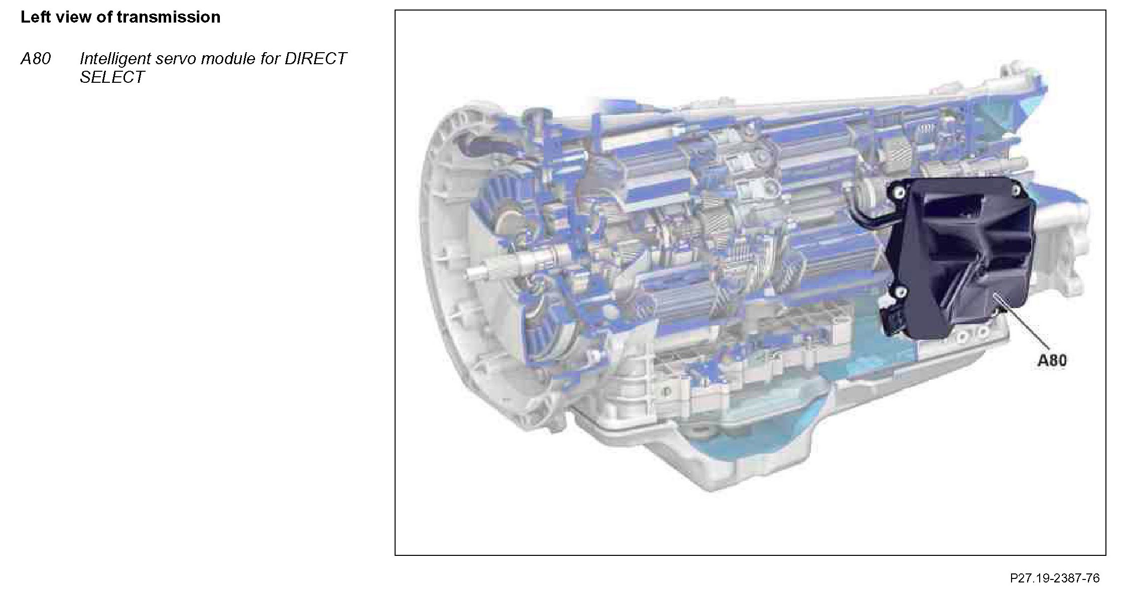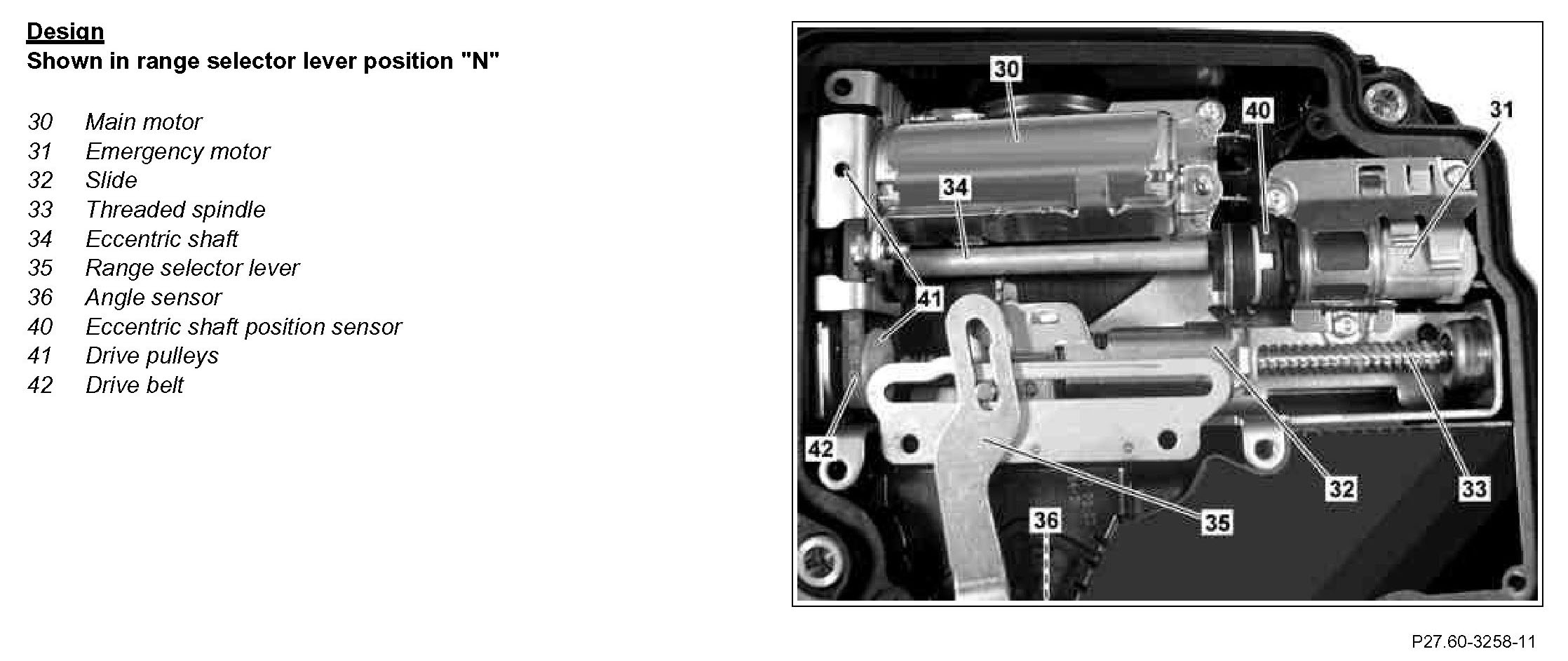 The gear "P", or from "P" into another gear as selected by the driver is not transferred via a rod (mechanical connection) from the control to the transmission but rather by means of an electronic connection ("wire"). This electronic connection consists of the DIRECT SELECT gear selector switch (S16/13) and the intelligent servo module. The overall system is called "Shift-by-wire". The intelligent servo module receives signals from the angle sensor, which records the actual positions of the range selector lever and the eccentric shaft. The intelligent servo module controls the main motor and the emergency motor.