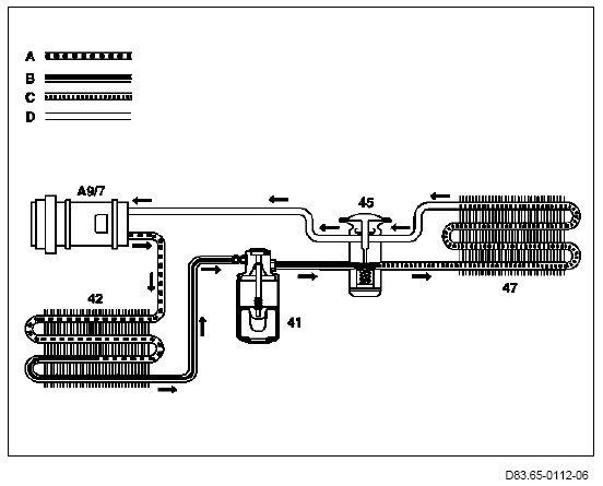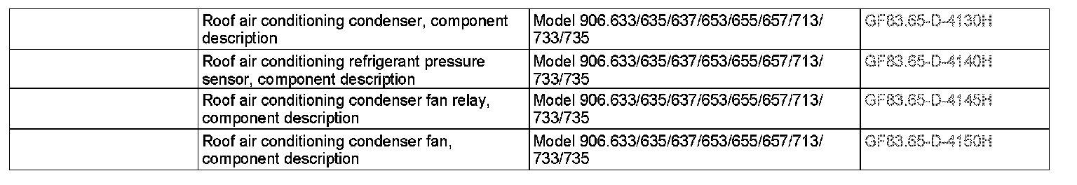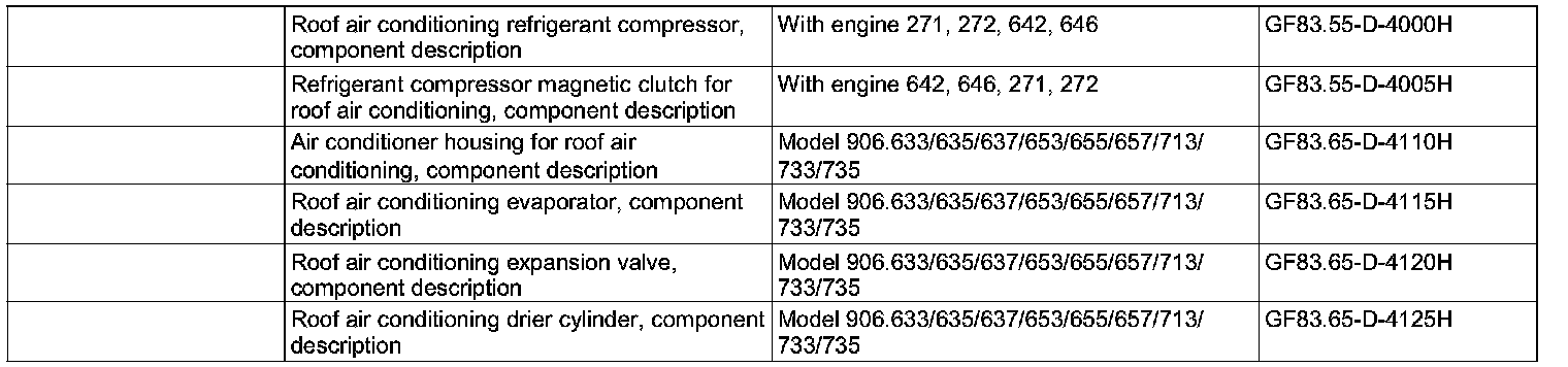 The 2nd refrigerant compressor that is driven by the engine compresses the gaseous refrigerant that is drawn in by the low pressure (gaseous), causing it to heat up. Following this, the gaseous refrigerant is forwarded over the high pressure (gaseous) into the roof air conditioning condenser. Once there, compression heat is extracted from the refrigerant with the aid of the air flow over the surface of the roof air conditioning condenser generated by the roof air conditioner 1 additional fan (M4/16) and the roof air conditioner 2 additional fan (M4/17), whereby the refrigerant cools down. As it is cooling down, the refrigerant liquefies (condenses). Then the liquid refrigerant is forwarded to the roof air conditioning desiccant cartridge via the high pressure (liquid). Any contamination or water content in the liquid refrigerant is removed in the roof air conditioning desiccant cartridge. After being cleaned in the roof air conditioning desiccant cartridge, the liquid refrigerant is forwarded over the high pressure (liquid) to the roof air conditioning expansion valve. The roof air conditioning expansion valve regulates the flow of refrigerant to the roof air conditioning evaporator depending on the low pressure (gaseous) and the temperature at the roof air conditioning evaporator outlet.