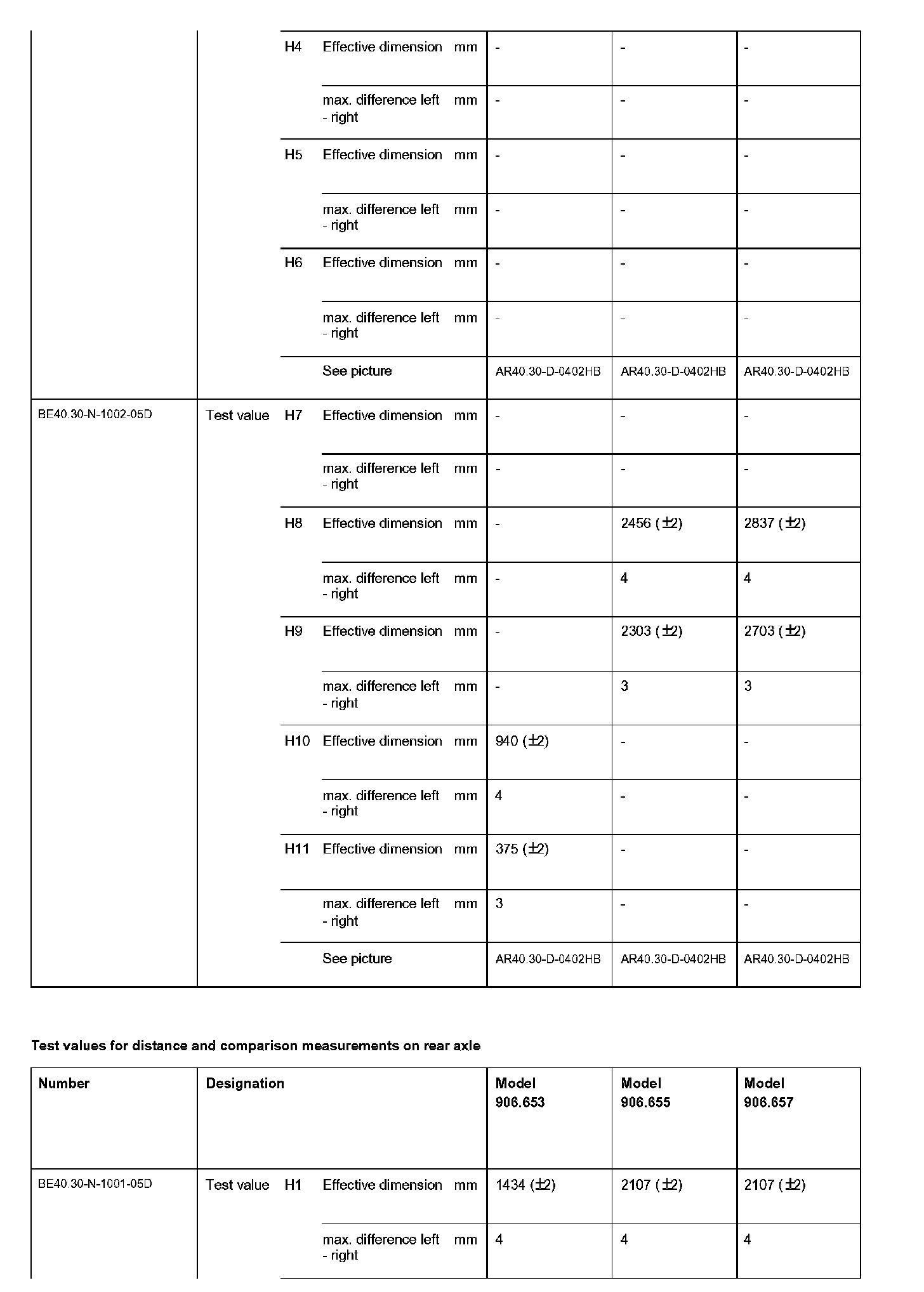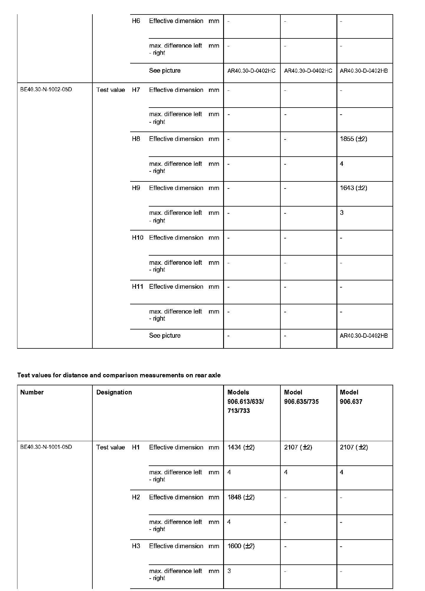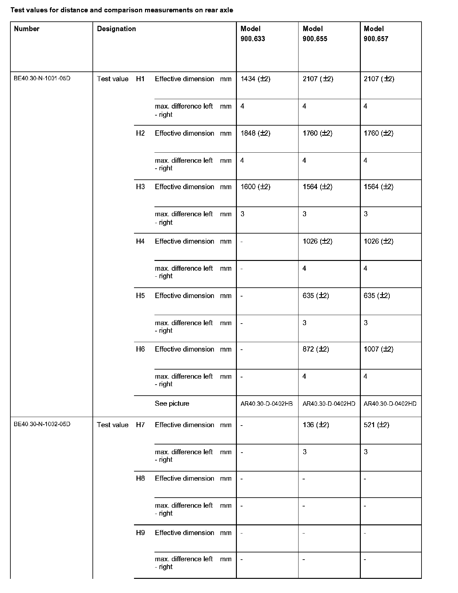 BE40.30-N-1000-05D Test Values For Distance and Comparison Measurements on Rear Axle