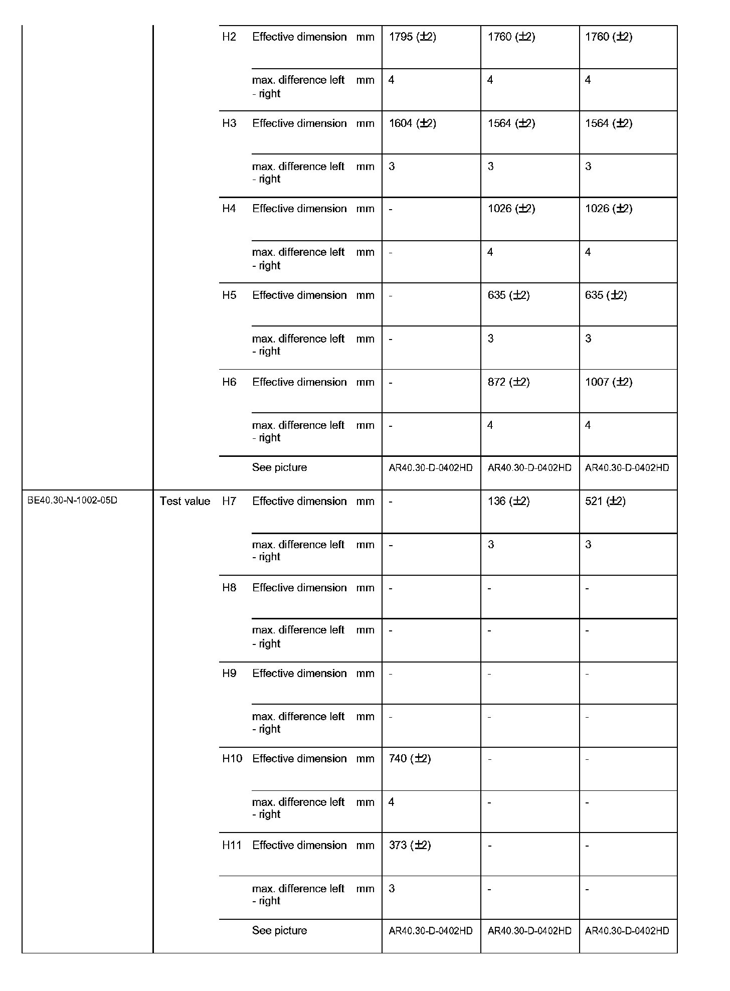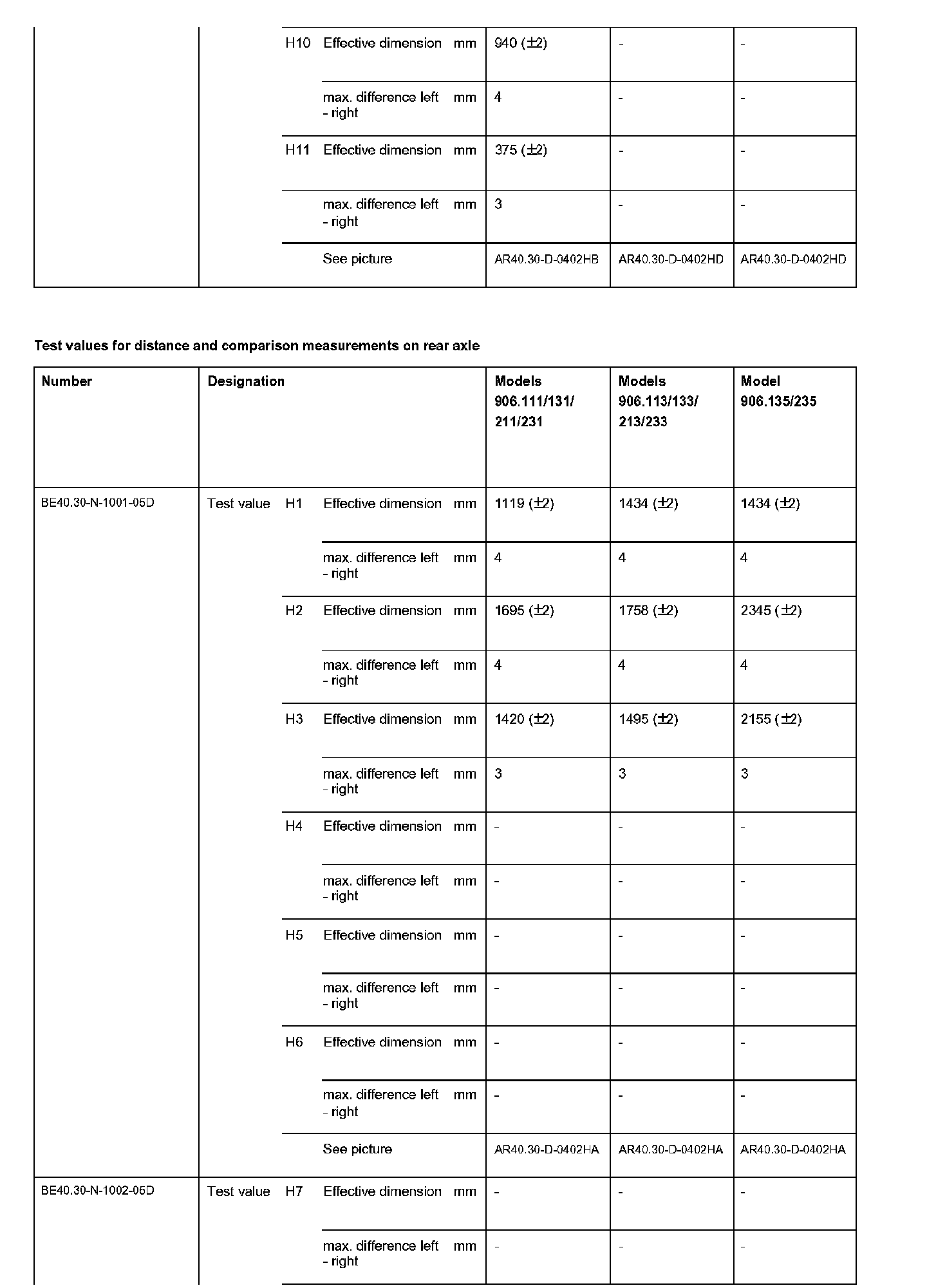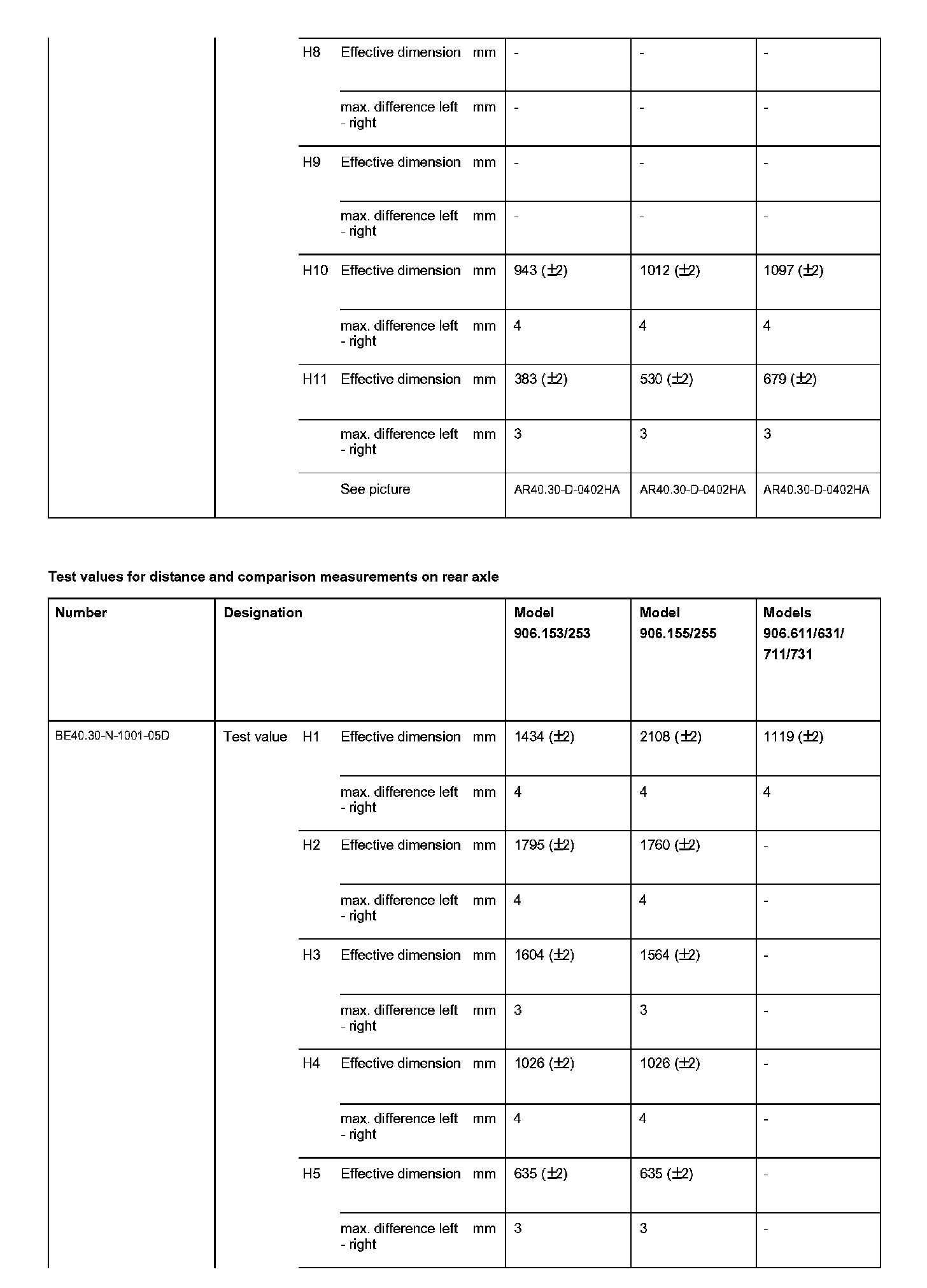 BE40.30-N-1000-05D Test Values For Distance and Comparison Measurements on Rear Axle