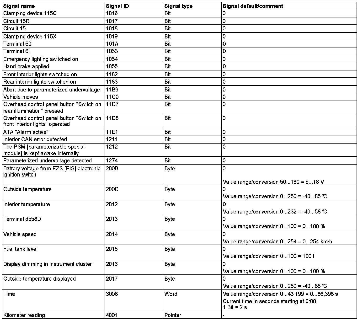 GF54.21-D-3022H Signal List For Vehicle Status, PSM, Function
