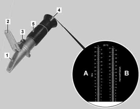 It is recommended to adjust the hand refractometer BLUETEC (5) before every checking procedure.
