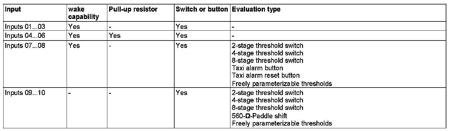 The properties of the discrete inputs regarding wake capability and activation of pull-up or pull-down resistors and type of input (switch or button) can be changed via DAS. The various setting options are listed in the table below.