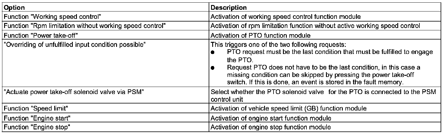 Only the functions of working speed control (inch. fixed speed and hand throttle actuator) and power take-off (PTO) are possible on gasoline engines. The engine speed limit, torque limit and vehicle speed limit (GB) functions as well as the engine remote start/stop function are not supported.
