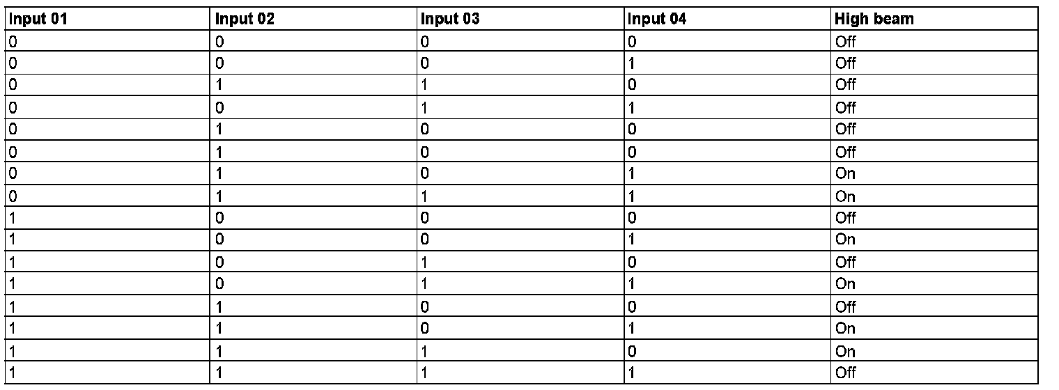The high beams are to be switched on if a signal with "HIGH level" is applied either at discrete inputs 01 and 04 or at discrete inputs 02 and 03 (see the truth table).