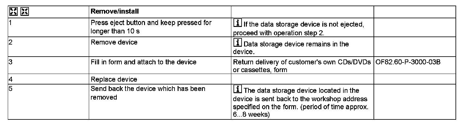 The return delivery of the data storage device, located in the device, can only be ensured when replacing the device in the case of warranty/goodwill if the return delivery form which is filled in completely and legibly is attached to the device which is the subject of complaint and the device is sent back immediately after removal.