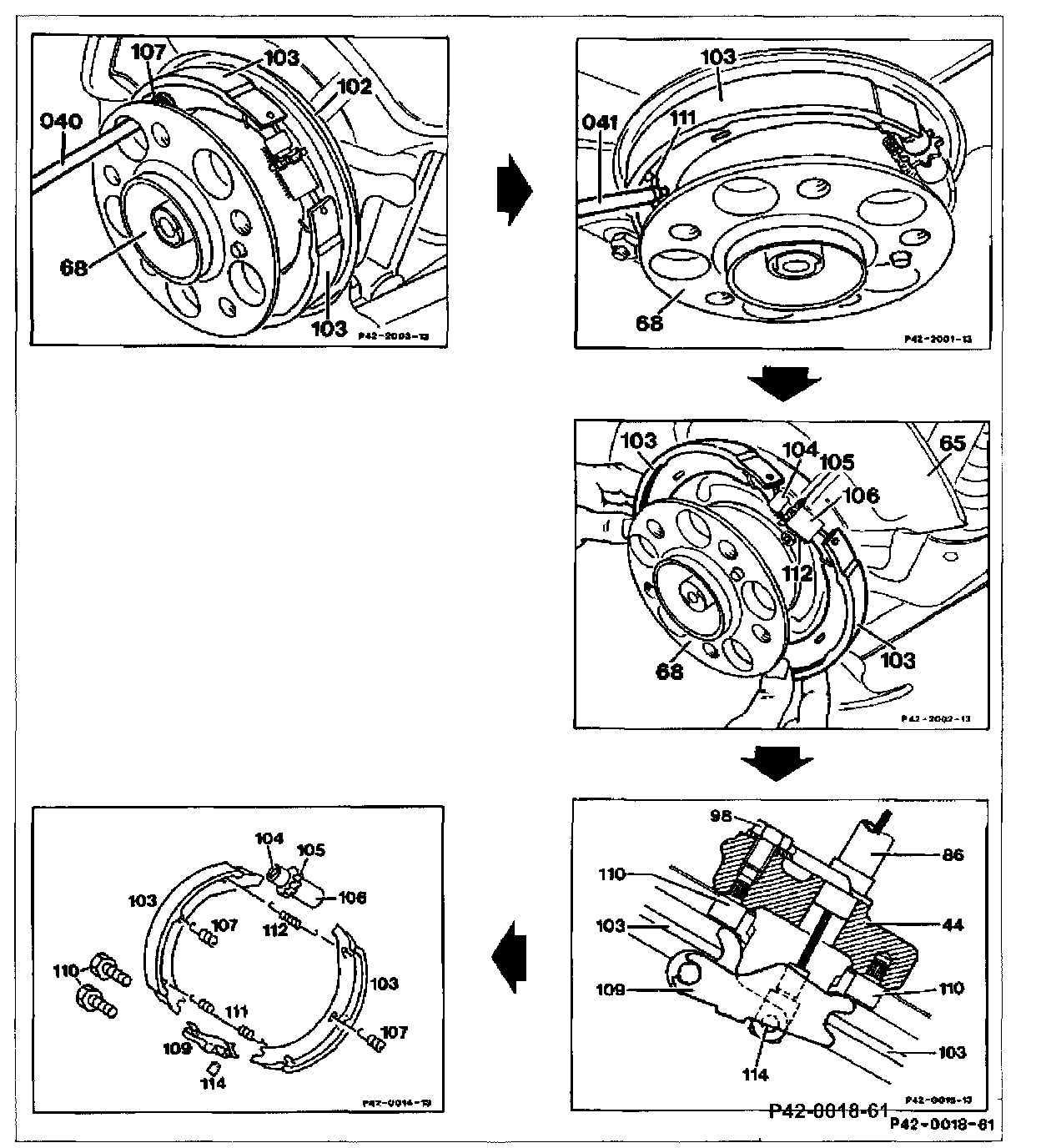 - Pull brake shoes (103) apart until they can be removed over the rear axle shaft flange (68). During installation install adjusting device (104-106) in both brake shoes so that adjusting wheel (105) points toward the front, on vehicles with anti-squat control downward.