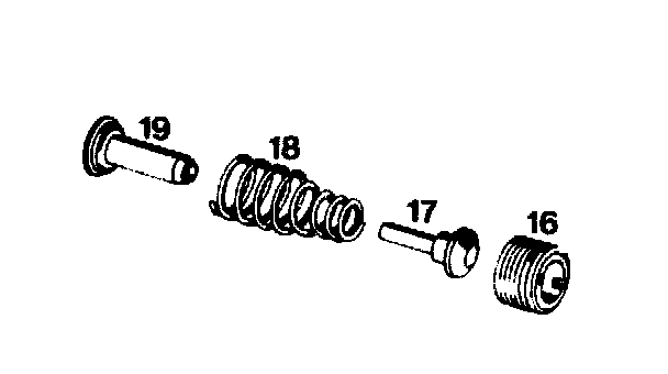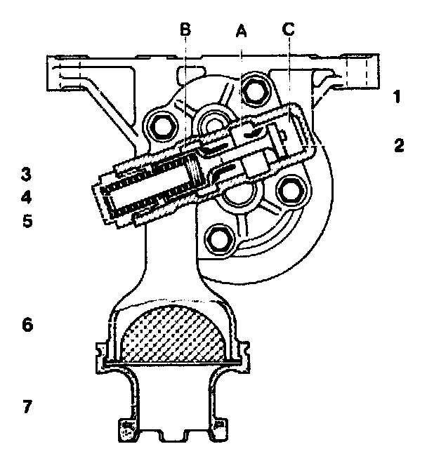 At a gauge pressure of 8 bar (up to April 1985) and of 5.5 bar (as of April 1985), the oil from the feed opening (A) shifts the piston (2) against the force of the compression spring (3).