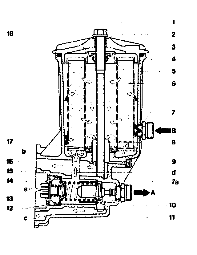 The oil filter is designed as a full flow filter. The engine oil flows through the oil filter element (6) from the outside to the inside and continues in a cleaned state via the riser (8) and the duct (b) to the main oil gallery and further to the bearings.