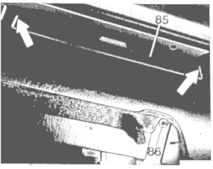 12 Install Bowden cables. Insert frame (88) with connecting hose through opening of glove box and insert connecting rod (87) (version up to 06/82) or fasten with Phillips head screw (version starting 07/82) (arrow) and adjust center nozzle flap. Make sure that the connecting hose is correctly seated.
