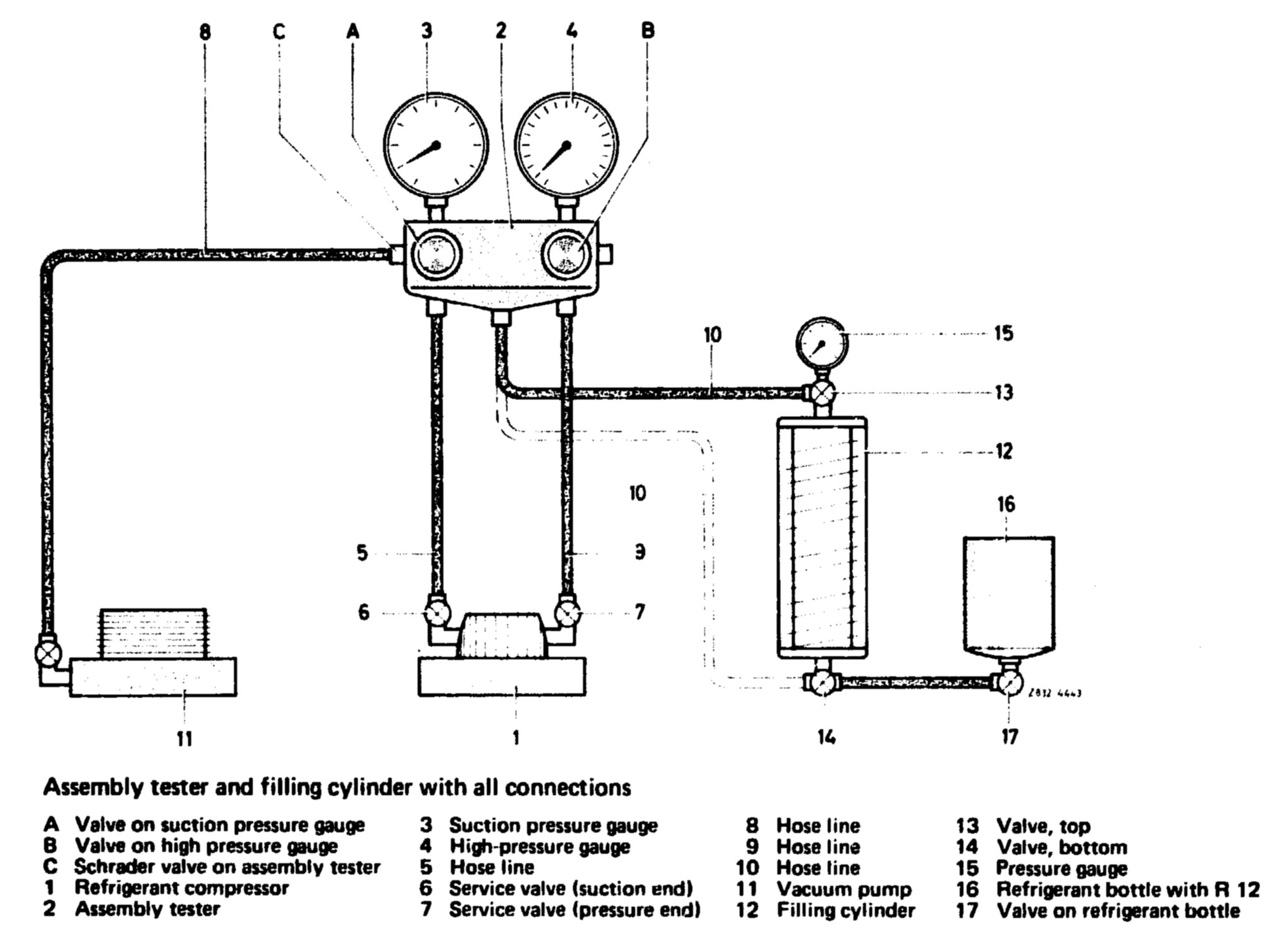 5. With valve opened (A and B) on assembly tester, let refrigerant vapor flow into refrigerant compressor. A bottle or filling cylinder pressure of 4 bar gauge pressure is required.