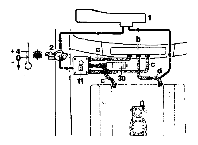 The dual heating water valve (8) controls the water flow to the heat exchanger. The heating water pump (10) is arranged next to the dual heating water valve and maintains an even flow of heating water through the heat exchanger at low engine speeds. Electrical control is by means of the electronic switching unit.