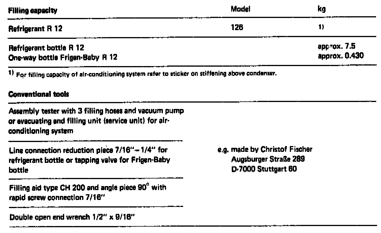 Note: Filling requires a supply bottle (1) with refrigerant which is commercially available just like e.g. a supply bottle with oxygen or acetylene gas. In addition. there are small cans (2) (Frigen-Babies), containing approx. 1/2 liter R 12. If hard to obtain, contact one of the specialist companies manufacturing or operating refrigerating units.