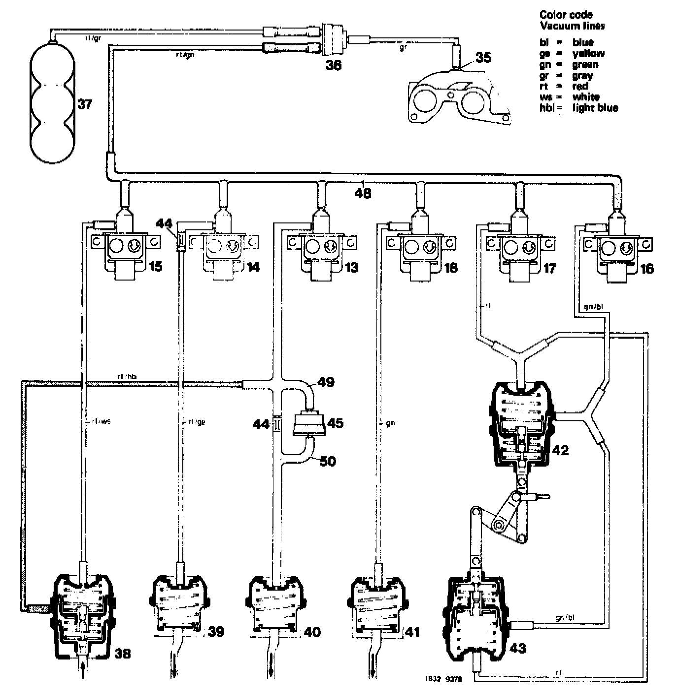 5. Evacuate vacuum circuit II, while paying attention to operation of defroster nozzle flaps. If gauge shows pressure increase, replace vacuum element (38) or vacuum line.