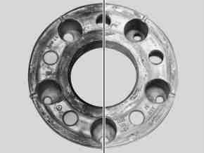 ^ Contact surfaces, joints and centering on disk wheel, wheel hub or wheel flange and brake disk or brake drum, Remove corrosion products using wire brush or emery cloth.