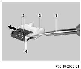 3 Lift locking catch (2) of retaining cap (4) using a suitable tool (1).